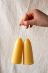Pair of hand dipped beeswax candles. Their wide base allows them to stand alone without a candle holder. Simply place on a candle plate or heat proof dish.