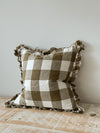 Olive gingham linen cushion with a ruffled edge.