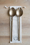 Pair of salad servers made from forged brass. Beautiful with other items from our tableware collection. This charming item elevates any dinner table. Would make an excellent house warming or wedding gift.
