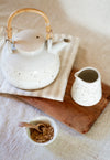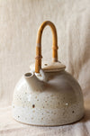 This large handmade stoneware teapot is perfect for sharing with a guest or two. Featuring a bamboo handle, and hand glazed finish, it embraces a rustic style by showing glaze drips and other perfect imperfections.